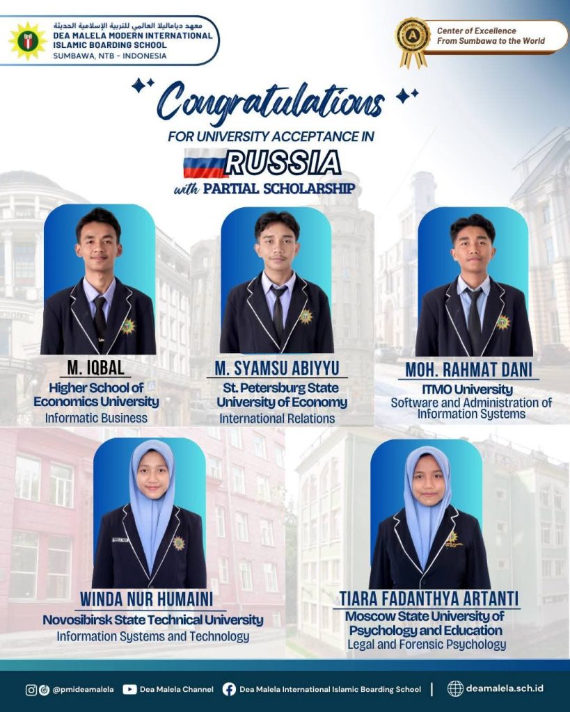 Tahun ini, lima santri Dea Malela diterima di berbagai universitas ternama di Rusia, yaitu: