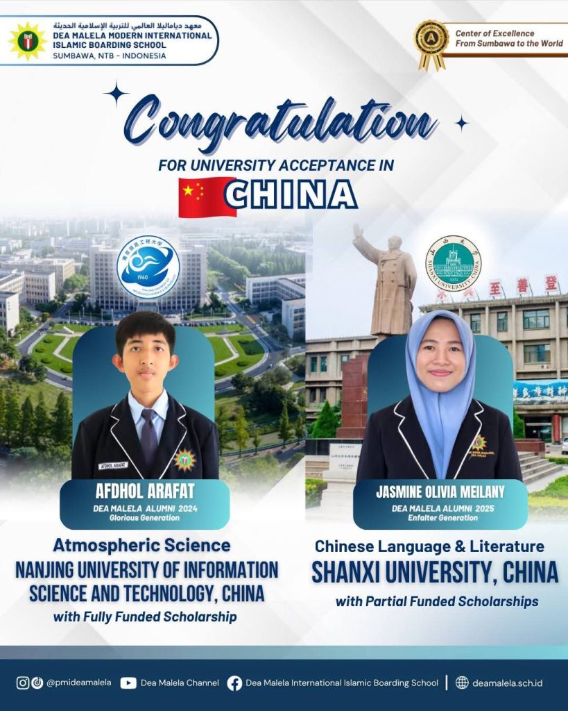 Sumbawa, NTB – Prestasi membanggakan kembali ditorehkan oleh Pesantren Modern Internasional (PMI) Dea Malela. Sejumlah santri dan alumni berhasil menembus perguruan tinggi bergengsi di Rusia dan China. Mereka diterima melalui jalur beasiswa penuh (fully funded scholarship) maupun beasiswa sebagian (partial scholarship).