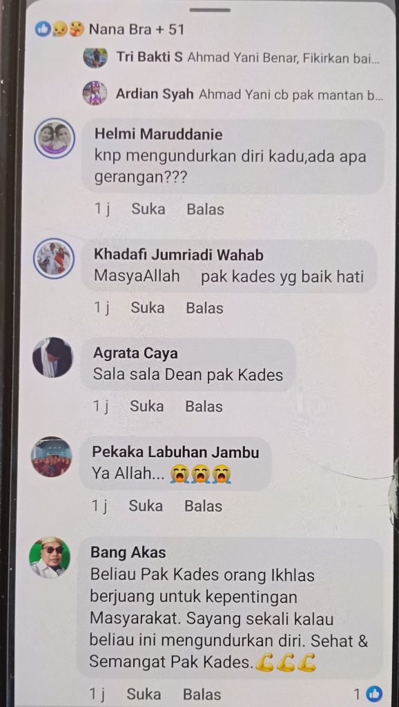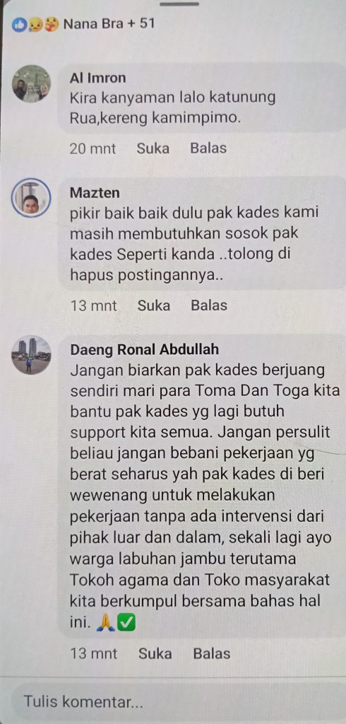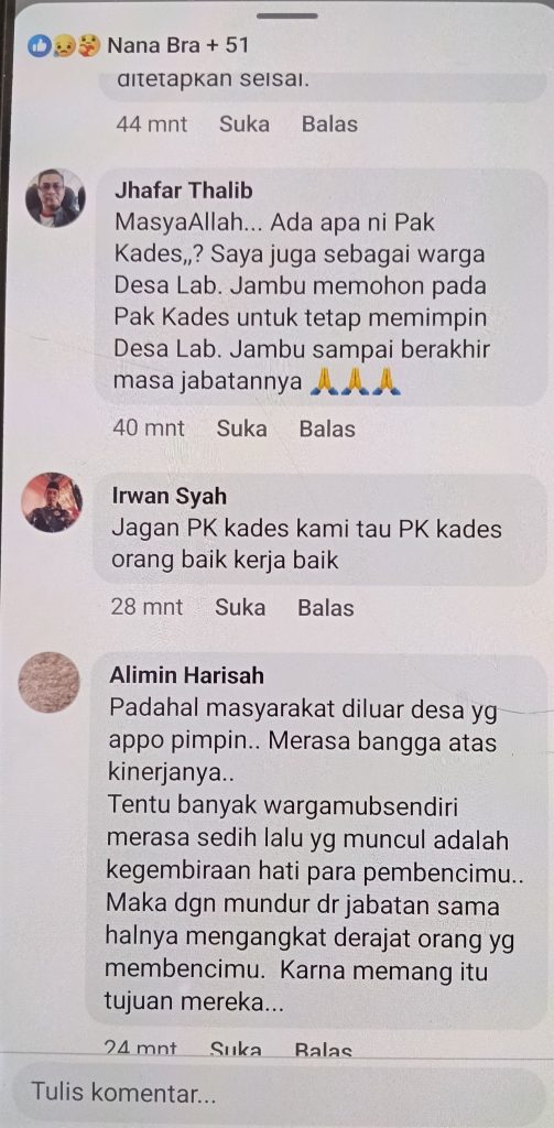 “MasyaAllah… Ada apa ini Pak Kades? Kami warga Labuhan Jambu memohon agar beliau tetap memimpin hingga akhir masa jabatan,” tulis salah satu warga, Jhafar Thalib.