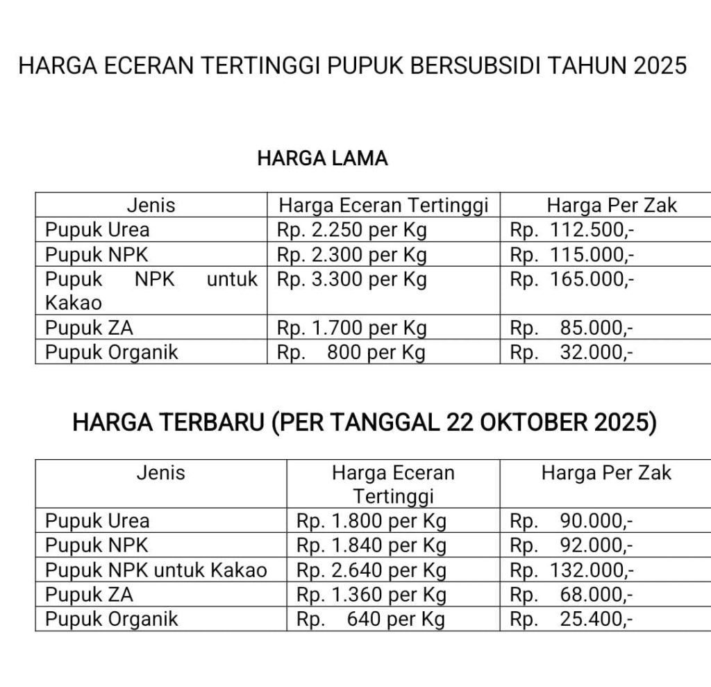 Penurunan juga menyentuh Pupuk ZA yang kini hanya Rp 1.360 per kilogram, dan Pupuk Organik yang turun menjadi Rp 640 per kilogram.